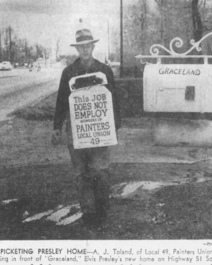 The man carrying the sign was A.J. Toland, representing Local 49 of the Painters, Decorators, and Paper Hangers Union (AFL). For a mansion that had barely begun to take shape as Elvis’s sanctuary, this moment marked one of the earliest and most unusual public controversies attached to the property.