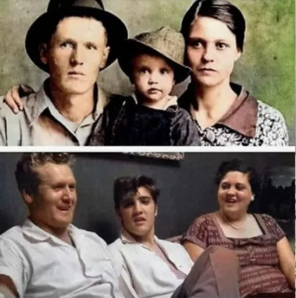 In images from 1945, Elvis appears simply dressed, his posture modest, his expression a mix of innocence and quiet confidence. His eyes reflect curiosity and expectation, as if he senses that life holds something more, even if he cannot yet name it. Standing beside him, Gladys smiles warmly. Her expression is filled with love, pride, and reassurance. It is the look of a mother who sees potential but cares more about the child than any future success.